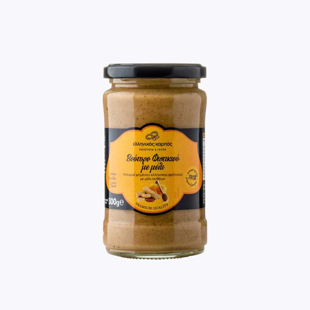 Το φυστικοβούτυρο με μέλι είναι ένα προϊόν ανάμειξης βουτύρου φιστικιού με ελληνικό ανθόμελο. Πράγματι, η γλύκα του μελιού σμίγει εξαίσια με την ιδιαίτερη προσωπικότητα του βουτύρου της αραχίδας και μαζί βάζουν στοίχημα να ξετρελάνουν τον ουρανίσκο μας.